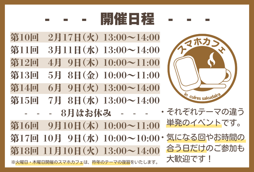 ・追加曜日の火曜日&木曜日は、昨年のスマホカフェのテーマで復習!
